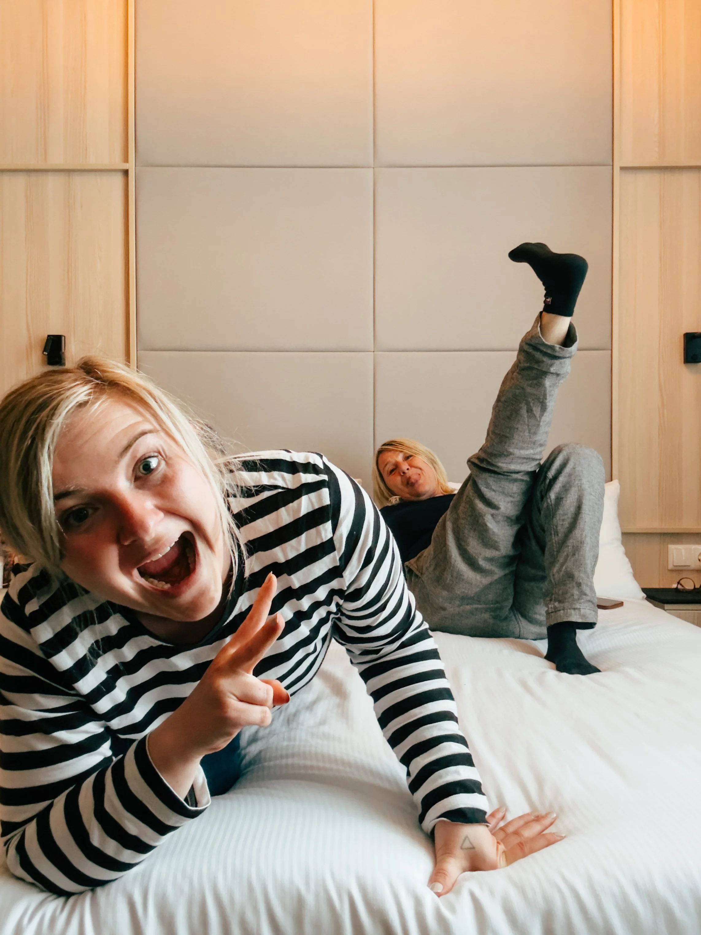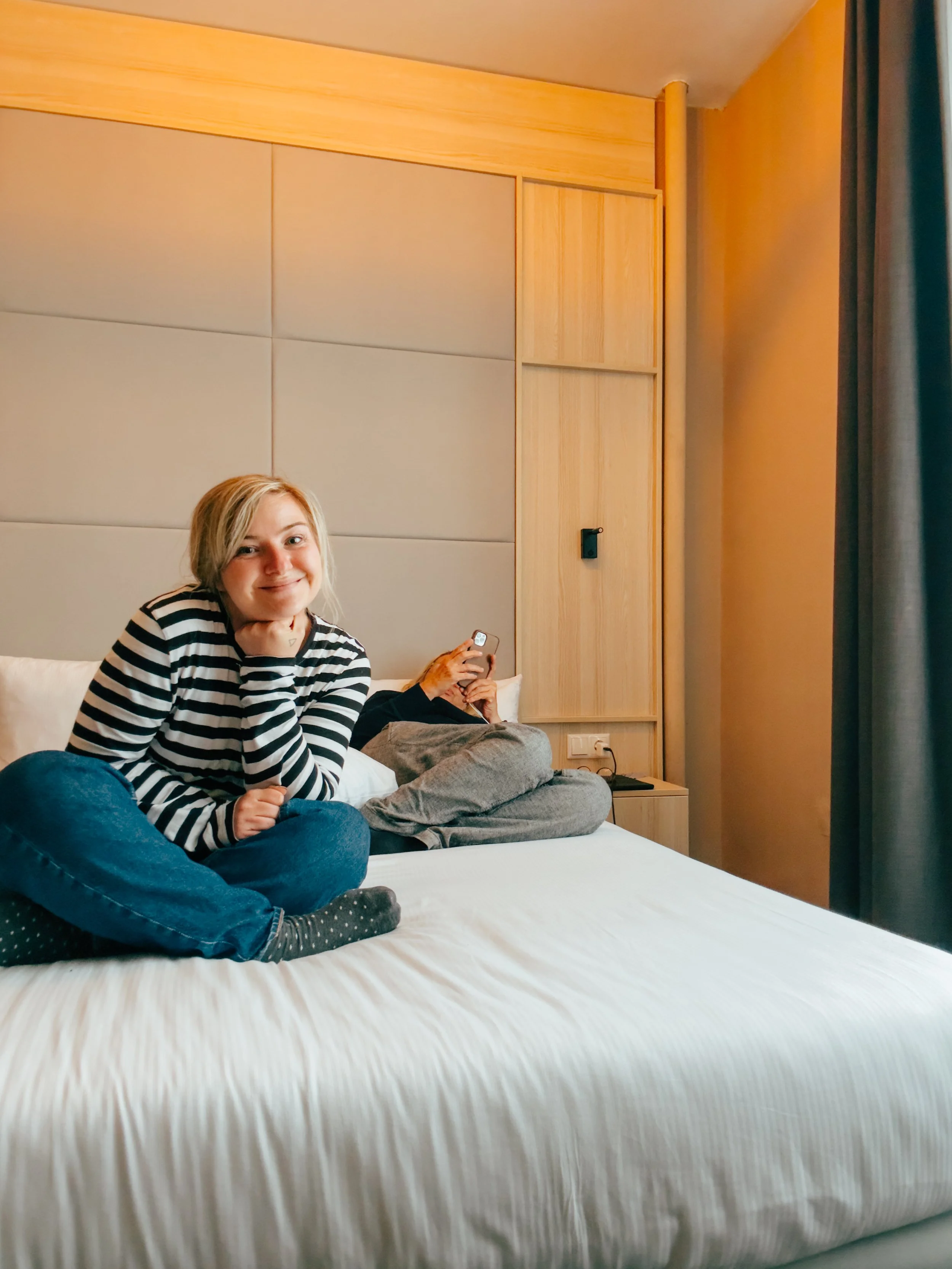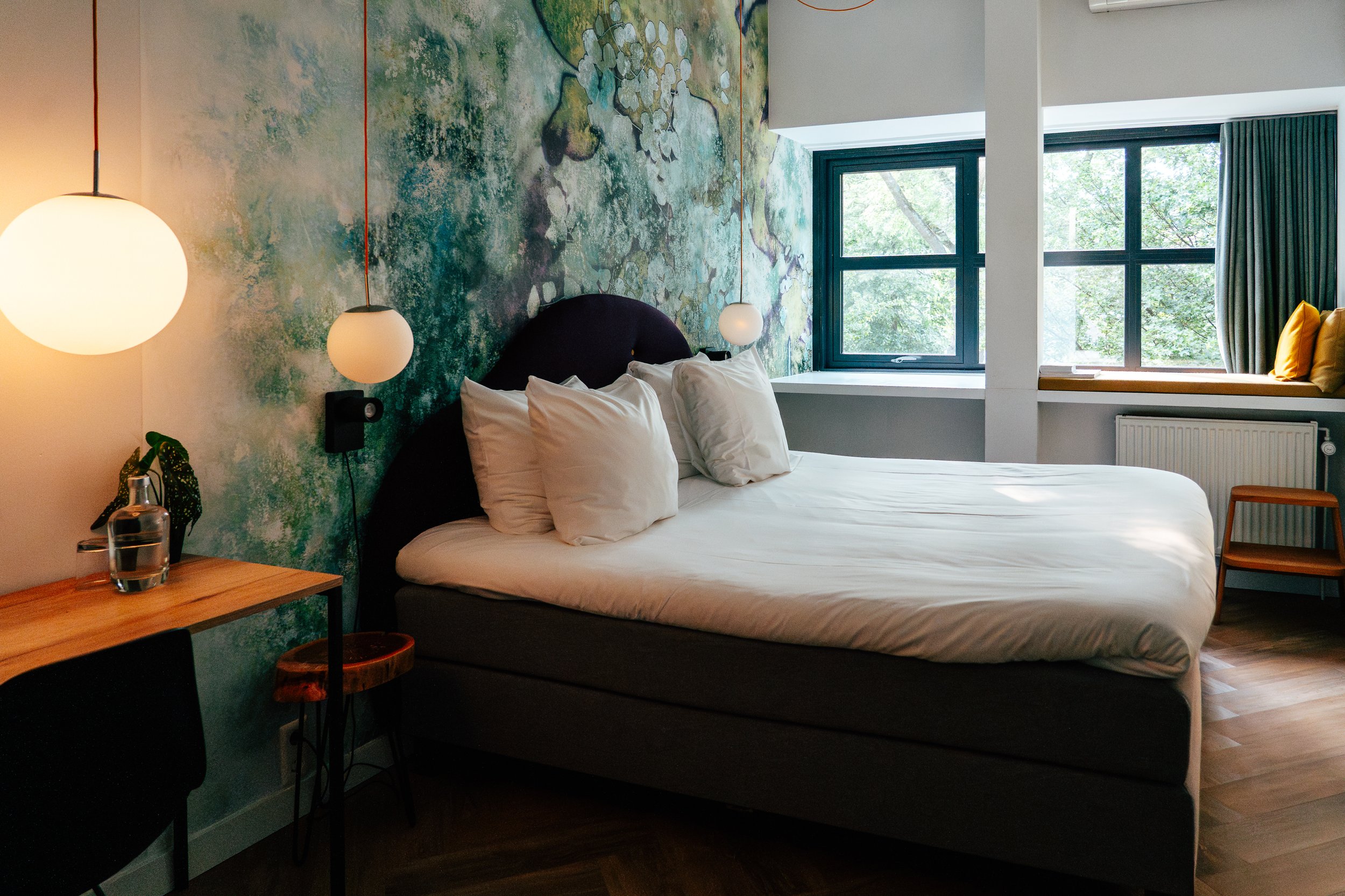 View from a bedroom window with sheer curtains, showing a forest landscape, private stay